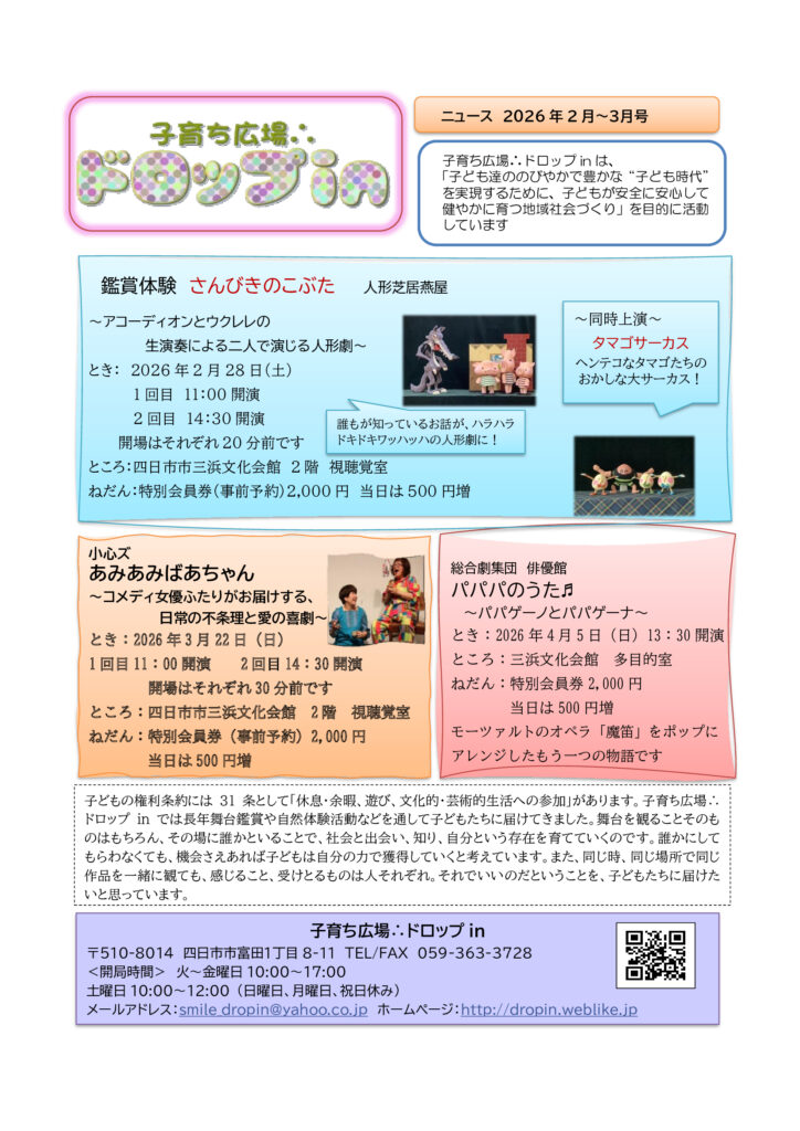 Featured ドロップinのページへようこそ Published 2020年8月14日 by drop_in 0 ドロップinのページへようこそ 子育ち広場∴ドロップinは、四日市富田に事務所を構え、赤ちゃんから18才までの子どもたちが、心豊かに育つことができるよう様々な活動をしてます。詳しくは各ページをご覧ください。事務所は、誰でも気軽に遊びに来ることができる居場所です。